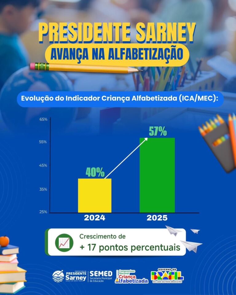 O crescimento do índice de alfabetização reforça o compromisso da gestão municipal com o fortalecimento da educação e a construção de novas oportunidades para os estudantes sarneyenses.